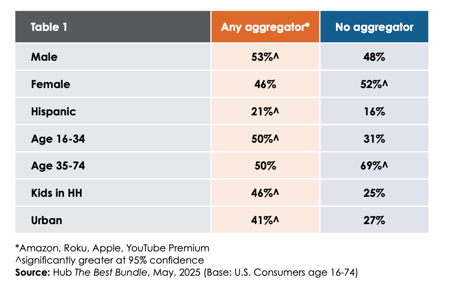 Across all Hub studies, people who love TV and subscribe to more services have a pretty clearly defined profile. And the viewers who use aggregators fit many of the same characteristics. Aggregator users tend to be younger, more urban, and more likely to have kids at home. They also skew slightly male and Hispanic.